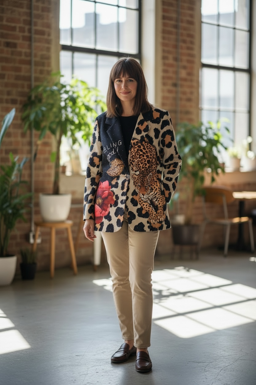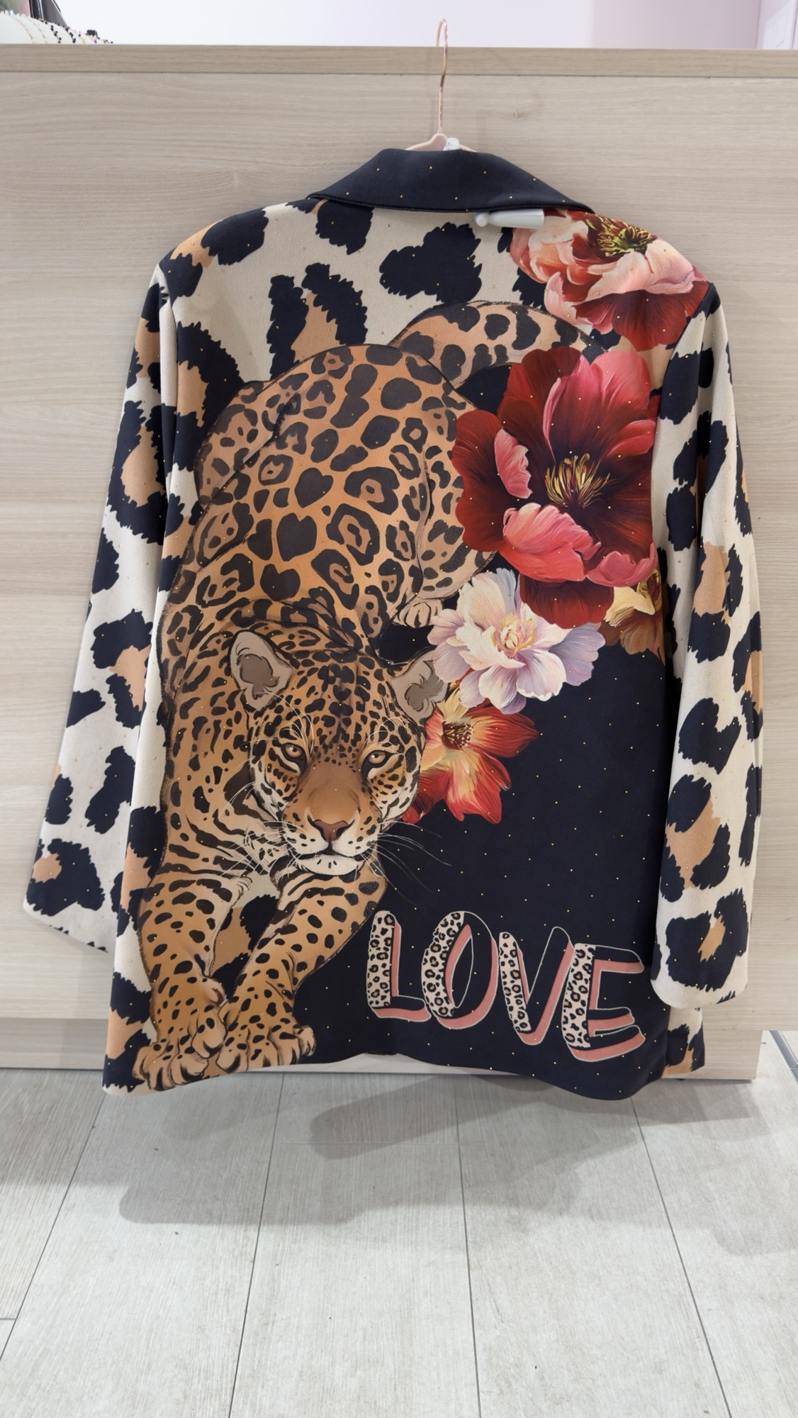 Americana estampada en animal print y con estampación tigre y floral , con pequeños remaches en dorado , talla unica , un poco oversize