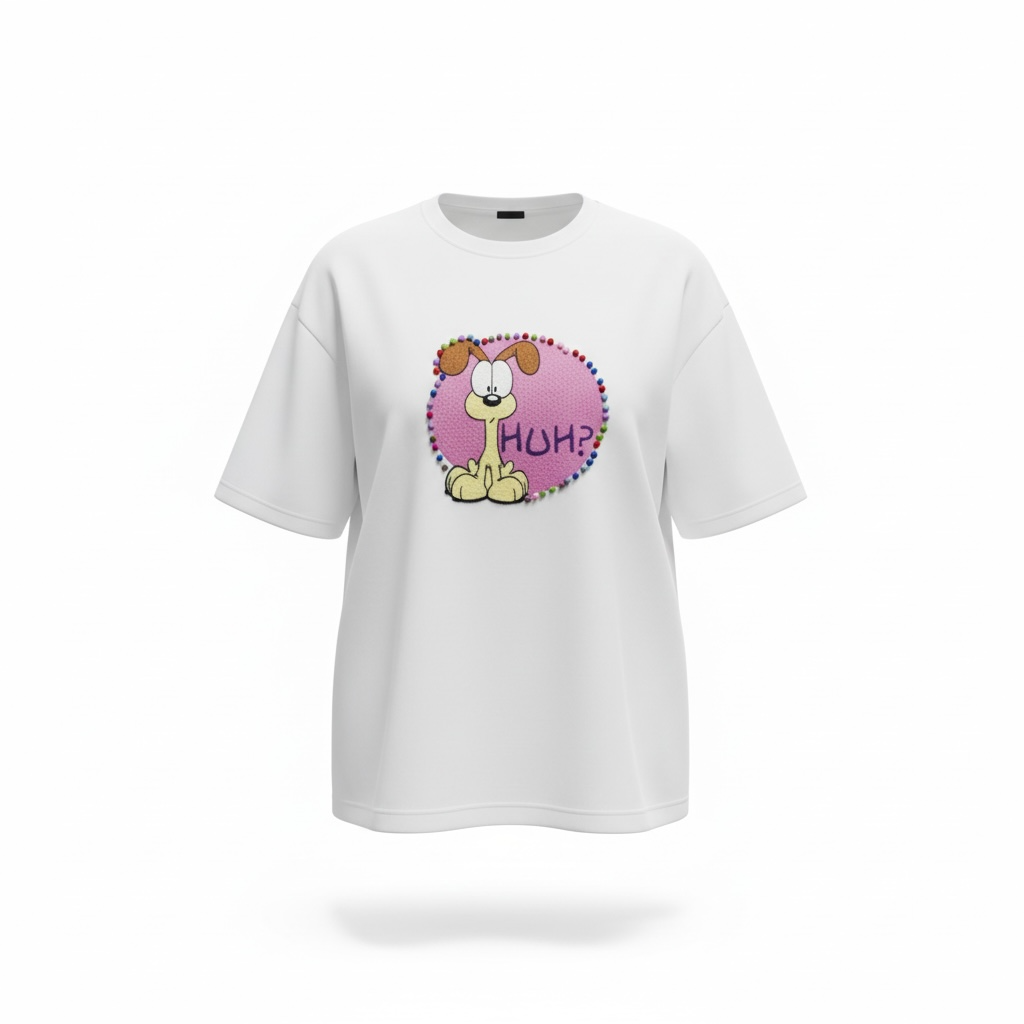 Camiseta Huh es pura divesión, color blanco y original estampado frontal estilo cartoon en tonos rosas aporta un aire desenfadado al look. Perfeta para quien disfruta la moda con humor, diseño minimalista que lo hace fácil de combinar con vaqueros o faldas haciendo que sea un básico diferente para el día a día.