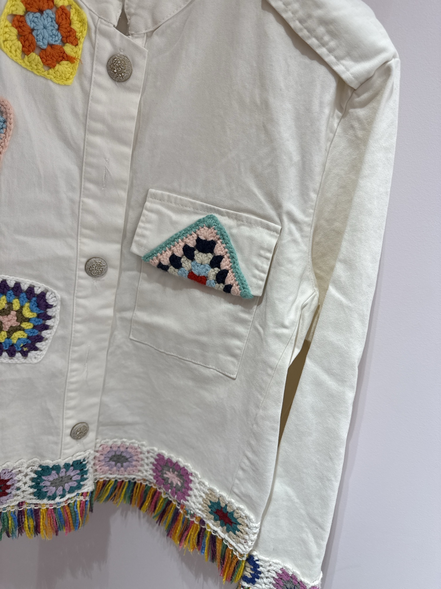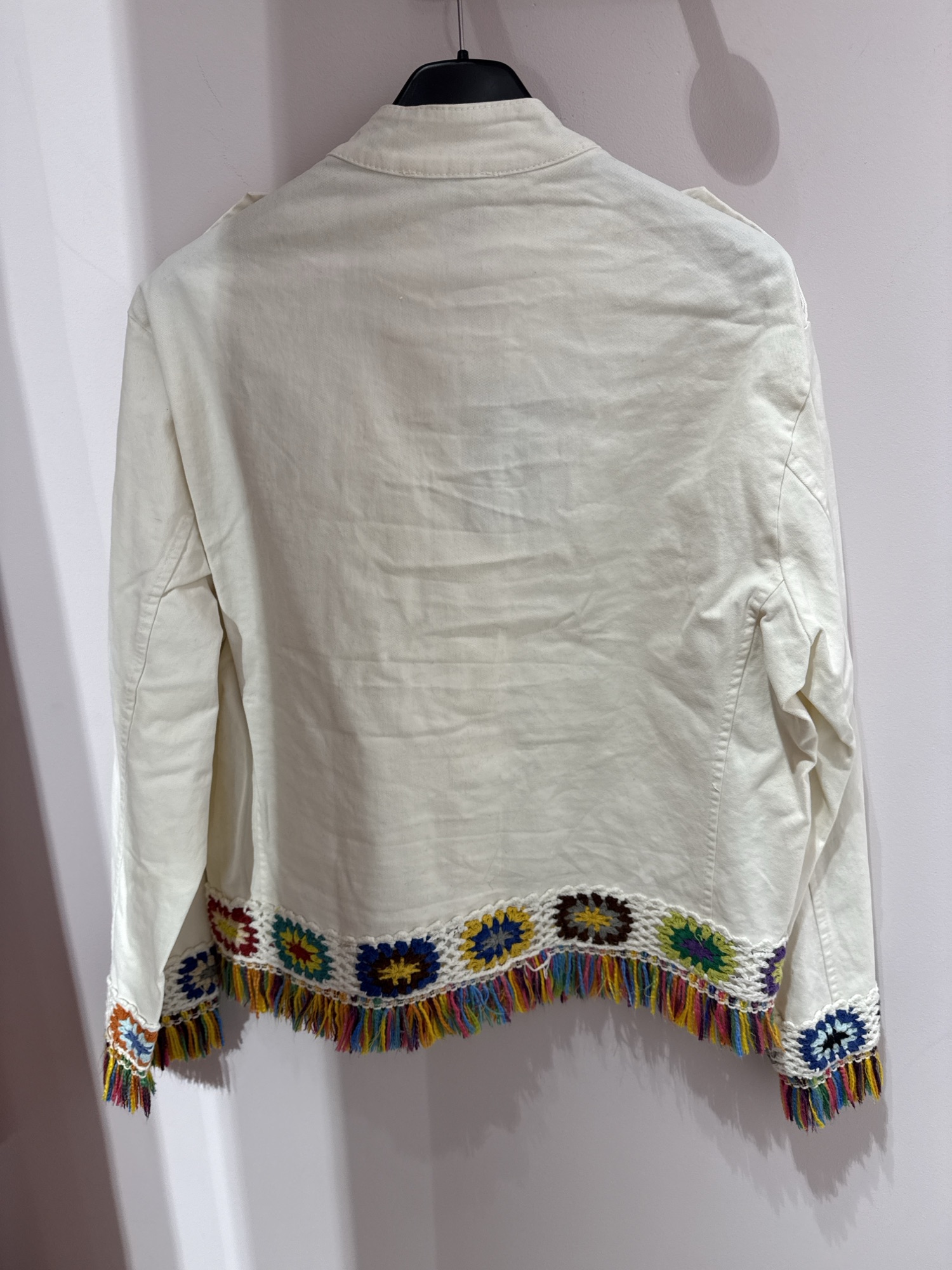 Chaqueta color crudo con detalles bordados y acabado con flecos, diseño clásico con botones y corte clásico te aportan un estilo bohemio. Perfecto para dar un toque diferente a tus looks, fácil de combinar con vaqueros.